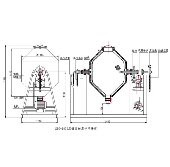 雙錐回轉(zhuǎn)真空干燥機(jī)為雙錐形的回轉(zhuǎn)罐體,罐內(nèi)在真空狀態(tài)下,向夾套內(nèi)通入蒸汽或熱水進(jìn)行加熱,熱量通過(guò)罐體內(nèi)壁與濕物料接觸。濕物料吸熱后蒸發(fā)的水汽。通過(guò)真空泵經(jīng)真空排氣管被抽走。由于罐體內(nèi)處于真空狀態(tài),且罐體的回轉(zhuǎn)使物料不斷的上下,內(nèi)外翻動(dòng),故加快了物料的干燥速度,提高干燥效率,達(dá)到均勻干燥的目的。